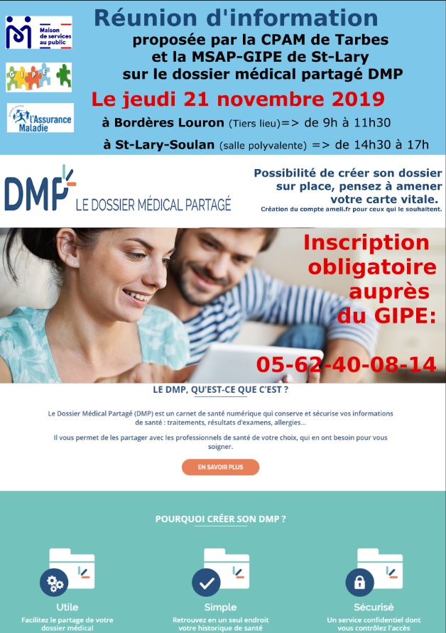 Le GIPE-MSAP de Saint-Lary et la CPAM des Hautes-Pyrénées vous proposent dans le cadre des ateliers numériques, une information sur le Dossier Médical Partagé avec possibilité pour ceux qui le souhaitent de le créer.