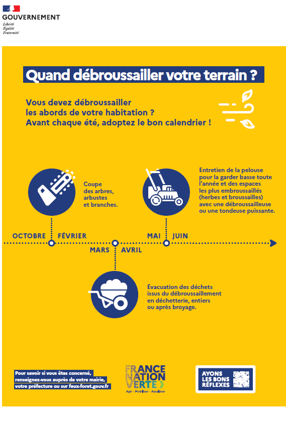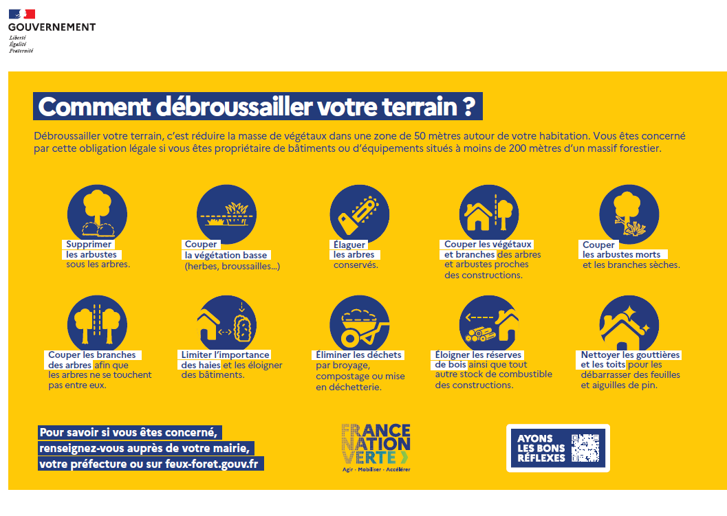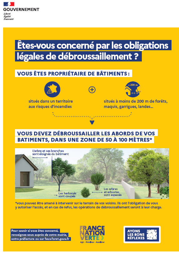 Pour savoir si vous êtes concerné par l’obligation légale de débroussaillement, vous pouvez contacter la mairie, la préfecture ou vous rendre sur feux-foret.gouv.fr, où vous trouverez toutes les informations utiles.