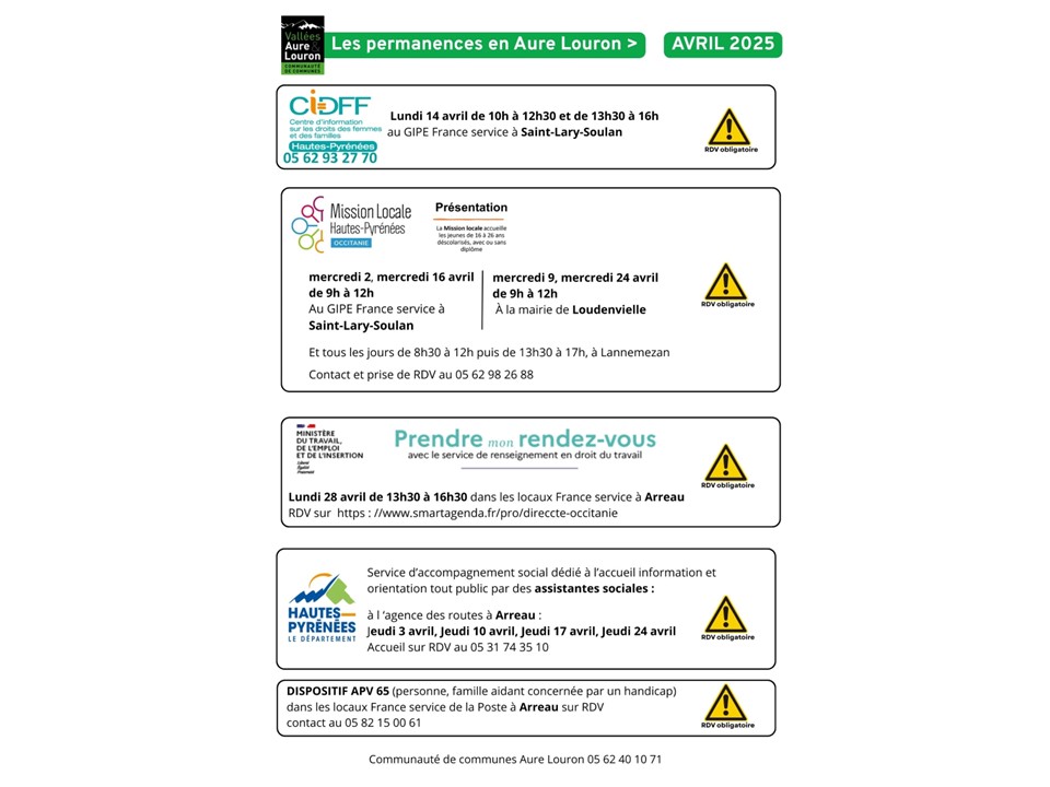 Les permanences en Avril 2025 : DDFIP, Renov'Occitanie, OPAH, France Services, Maison du travail saisonnier, CIDDF, Mission Locale, Accompagnement social
