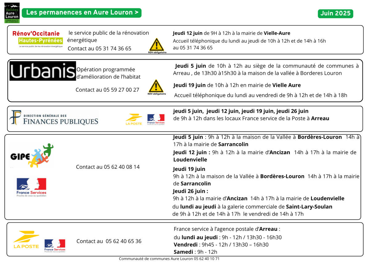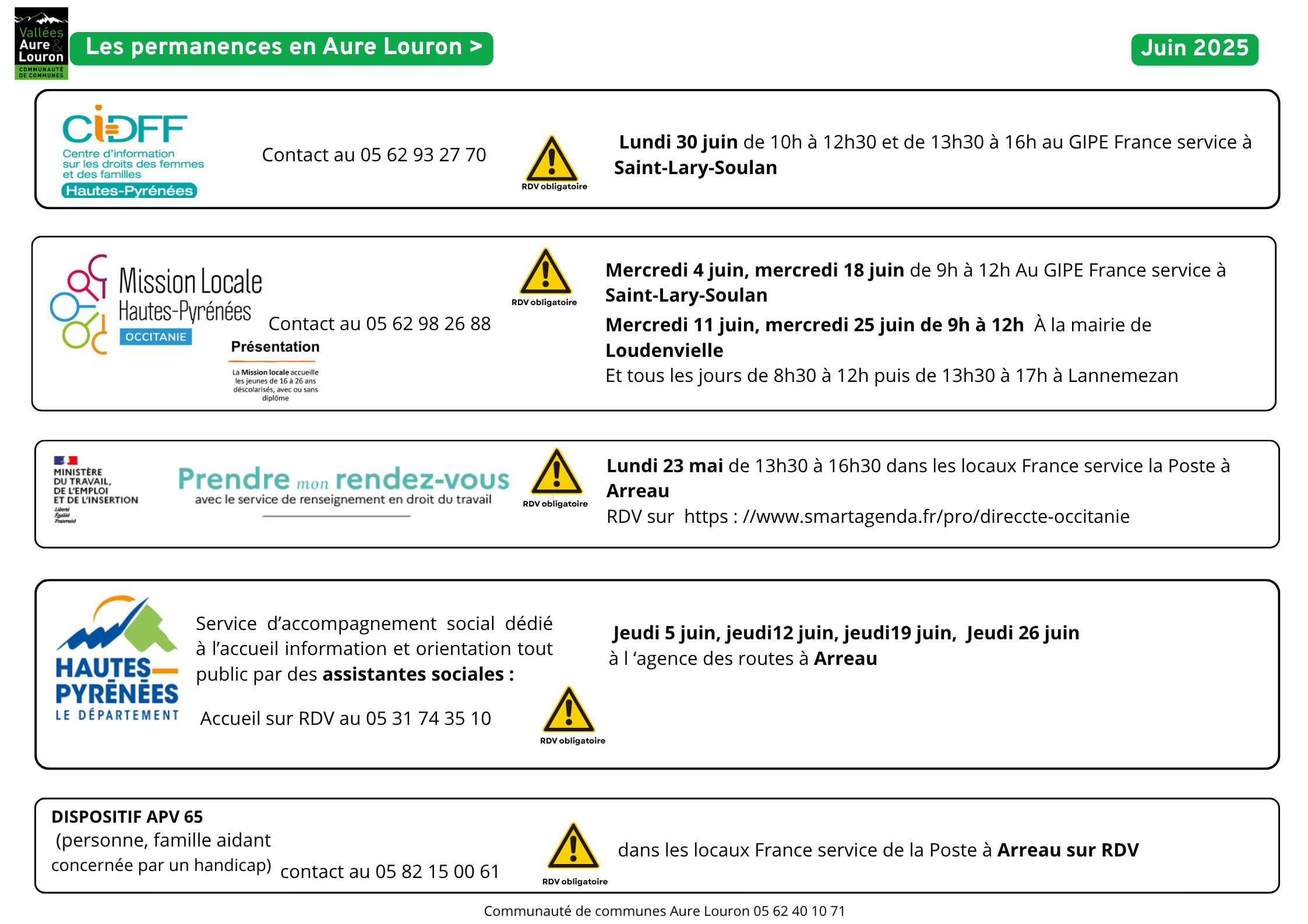 Les permanences en Juin 2025 : DDFIP, Renov'Occitanie, OPAH, France Services, Maison du travail saisonnier, CIDDF, Mission Locale, Accompagnement social